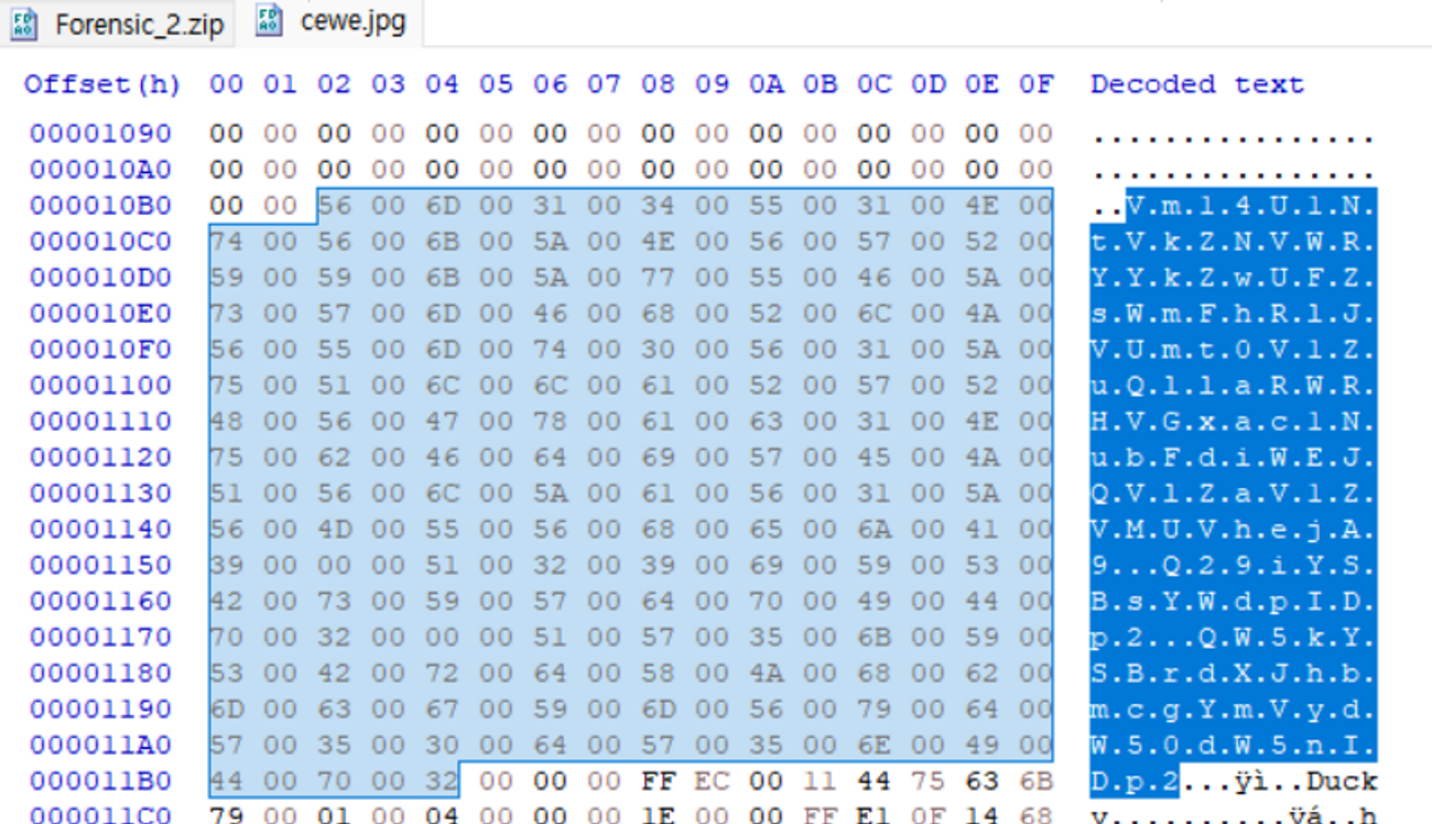 jpg 파일을 HxD 분석으로 살펴보면 텍스트 형식의 글자를 볼 수 있다. 이는 ASCII 값으로 Base 64 인코딩으로 보인다. 따라서 Vm14U1NtVkZNVWRYYkZwUFZsWmFhRlJVUmt0V1ZuQllaRWRHVGxac1NubFdiWEJQVlZaV1ZVMUVhejA9를 계속 복호화 돌려보다보면 flag 값을 찾을 수 있다.
