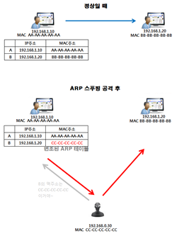1. 공격자가 A에게 자신의 MAC주소를 B의 MAC 주소인 것처럼 속인다.