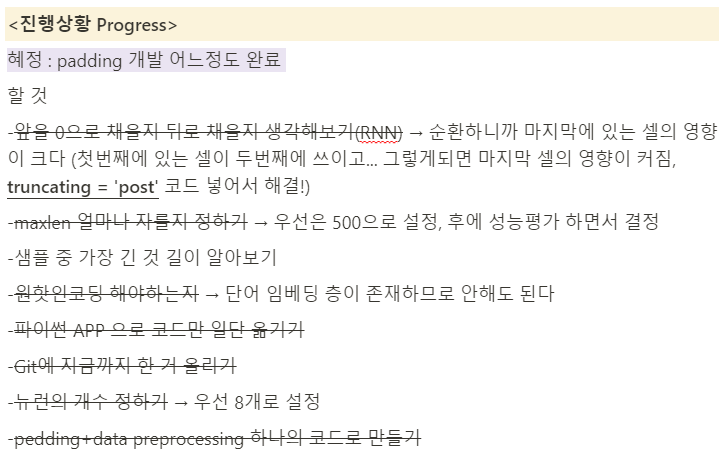 우리 프로젝트에서는 pad_sequences 명령어에 truncating = 'post'를 넣어 앞의 빈 부분을 0으로 채우도록 코딩하였다. 그 이유는 우리가 사용하는 엔진인 RNN은 순환하며 데이터를 학습하기에 마지막 셀의 영향이 엔진 학습에 가장 큰 영향을 미치기 때문이다. (첫번째에 있는 셀이 두번째에 쓰이고... 그렇게되면 마지막 셀의 영향이 커짐)