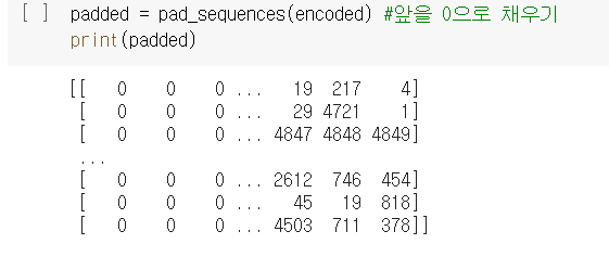 따라서 나는 from tensorflow.keras.preprocessing.sequence import pad_sequences, 케라스에서 제공하는 pad_sequences()도구를 사용하여 샘플의 길이를 일정하게 맞추는 작업을 진행하였다.