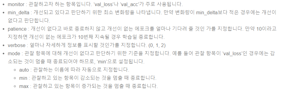 Epoch를 100으로 지정했더라도 학습하는 과정에서 EarlyStopping 콜백함수를 호출하여 해당 조건이 되면 학습을 조기 종료시킨다. EarlyStopping 콜백함수에서 사용할 수 있는 매개변수는 다음과 같다.