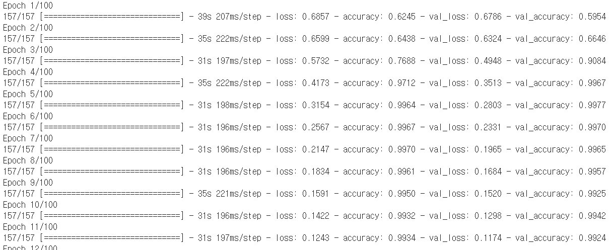 history = model.fit(x_train, y_train, epochs=100, batch_size=64, validation_data=(x_val, y_val), callbacks=[checkpoint_cb, early_stopping_cb])