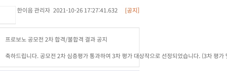 1차 합격 공지이다. 프로보노 프로젝트에서는 팀당 하나씩 팀블로그가 개설되는데 모든 공지를 이 블로그의 타임라인에 올려준다. 따라서 다른 팀의 합격 여부는 공개되지 않고 본인 팀의 합격 여부만 알 수있다.