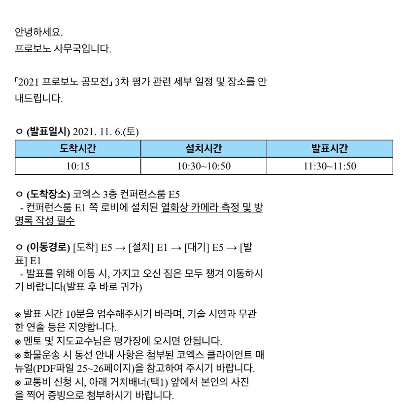 3차 발표 대상자에게는 프로보노 사무국에서 이렇게 매일로 도착 시간과 발표 시간 등을 안내해준다. 아마 매년 코엑스에서 종합평가를 진행한 듯 하다.